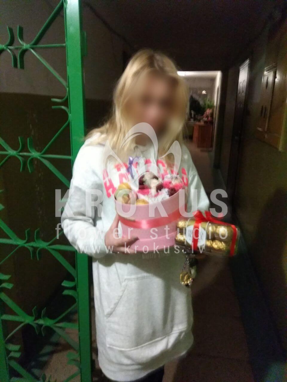 Mēs piegādājām vēl vienu pasūtījumu uz pilsētu Rīga. Pasūtītājs vēlējās: Ziedu piegāde Flowerbox ar macarooniem (Izmērs: