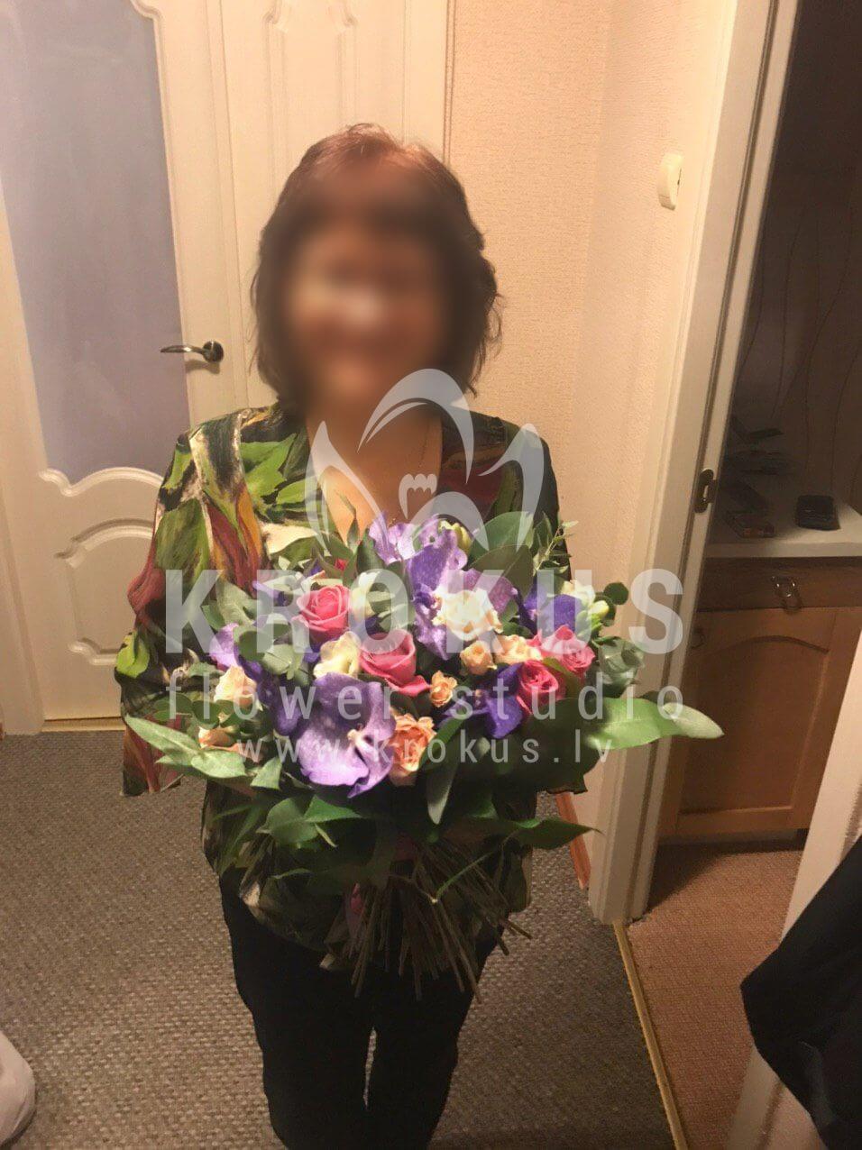 Ziedu sastāvā: Orhidejas, Rozā rozes, Krūmrozes, Frēzijas, Eikalipts.