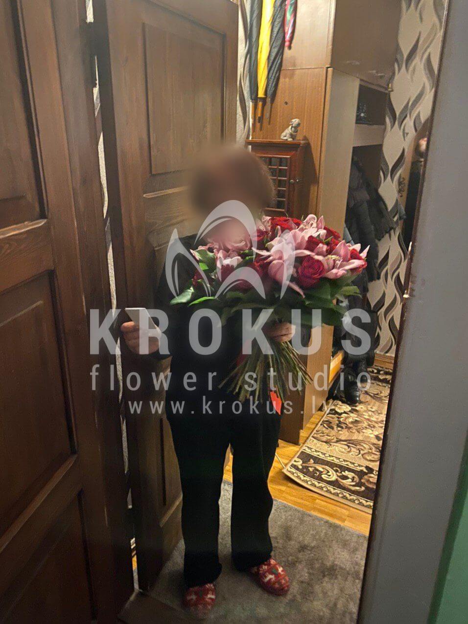 Ziedu sastāvā: Sarkanas rozes, Orhidejas, Salal (Goltjēra).