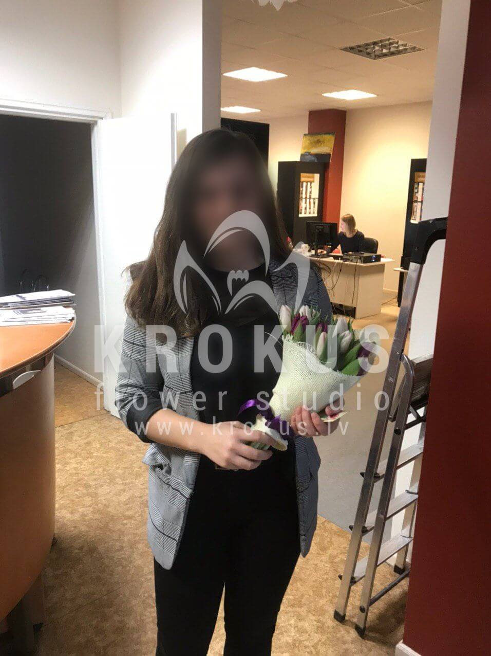 Mēs piegādājām vēl vienu pasūtījumu uz pilsētu Rīga. Pasūtītājs vēlējās: Ziedu piegāde Balto un violeto tulpju pušķis