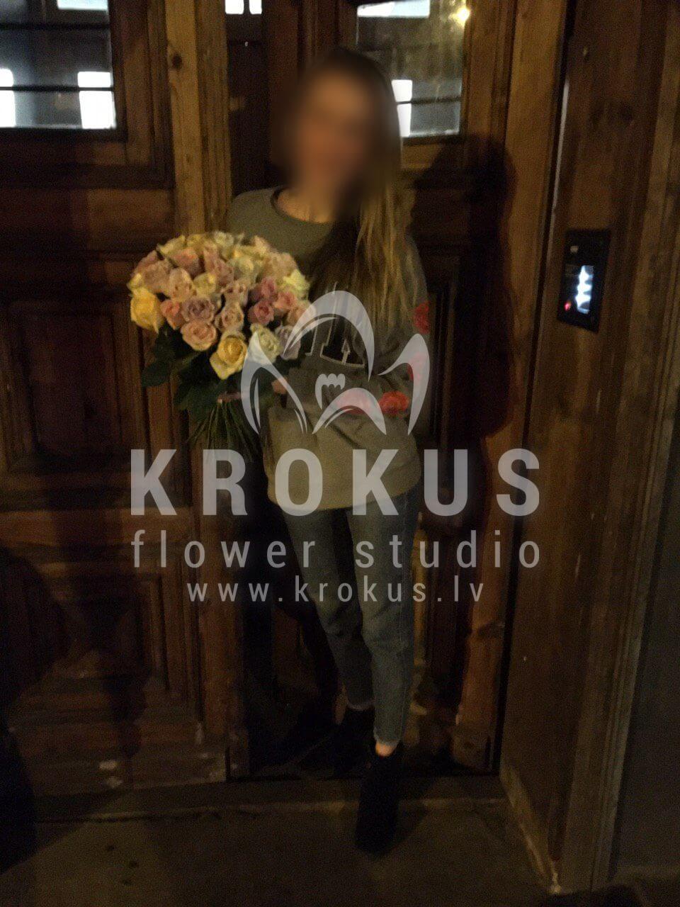 Ziedu sastāvā: Baltas rozes, Rozā rozes, Violetas rozes, Dekors.