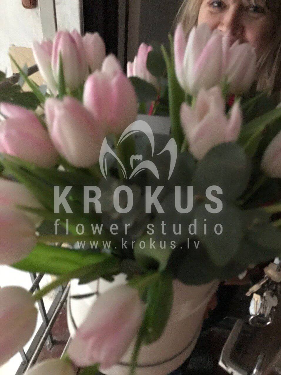 Ziedu sastāvā: Tulpes, Eikalipts, Stilīga kastīte.