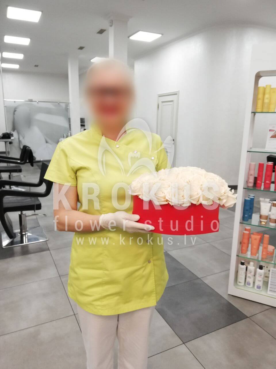 Ziedu sastāvā: Baltas rozes, Stilīga kastīte.