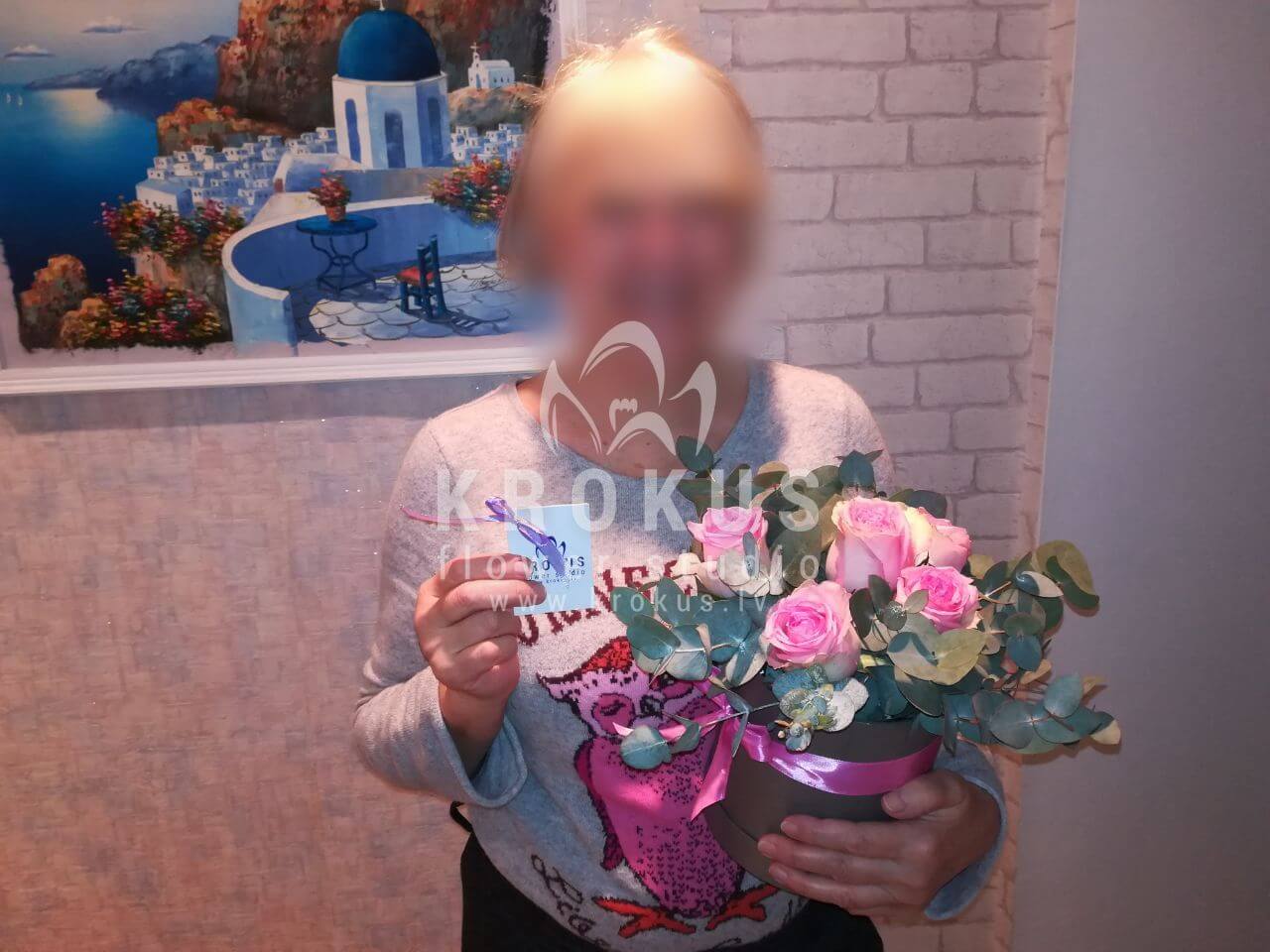 Ziedu sastāvā: Rozā rozes, Eikalipts, Stilīga kastīte.