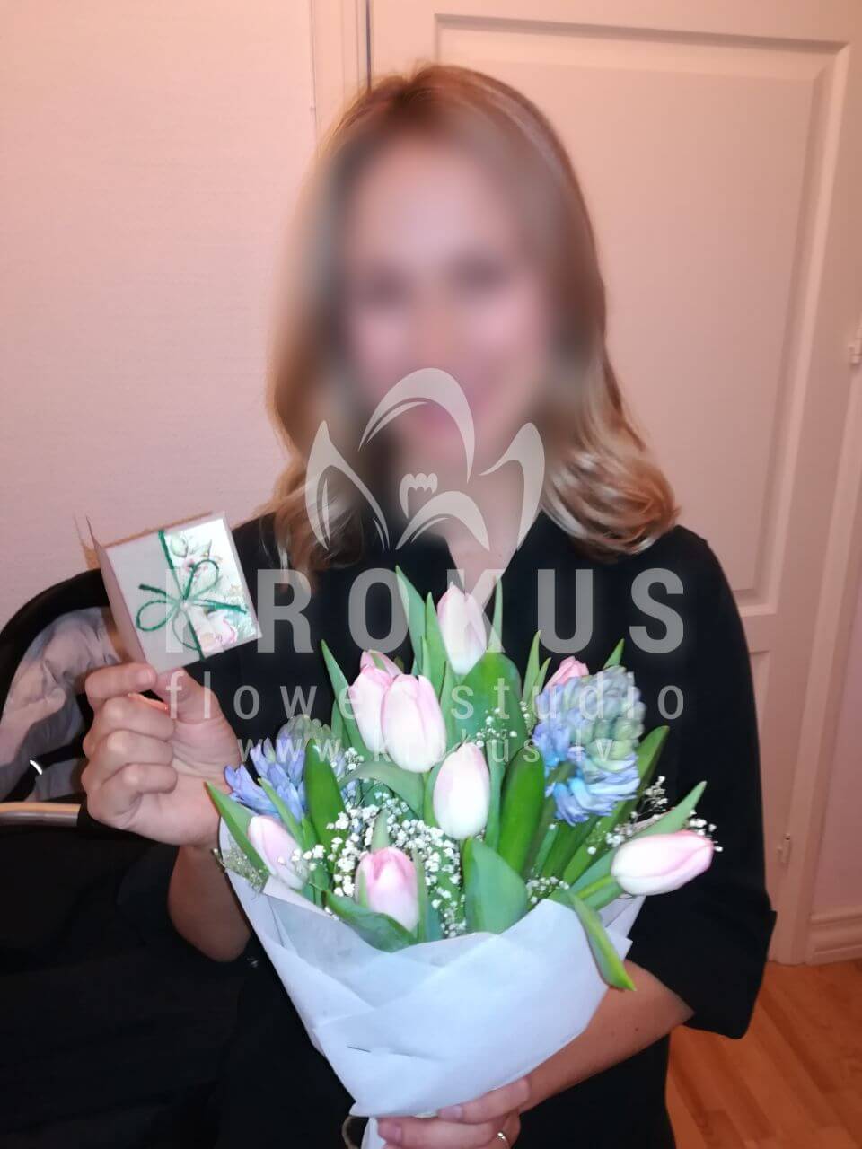 Ziedu sastāvā: Hiacinte, Tulpes, Gypsophila (Ģipsene).