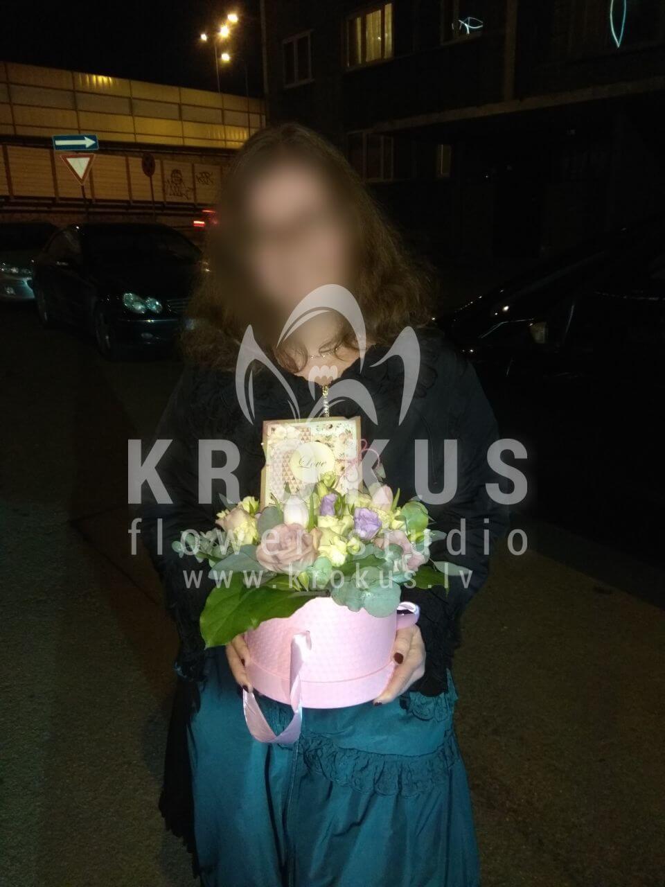 Ziedu sastāvā: Baltas rozes, Rozā rozes, Waxflower, Tulpes, Neļķes, Eikalipts, Stilīga kastīte.