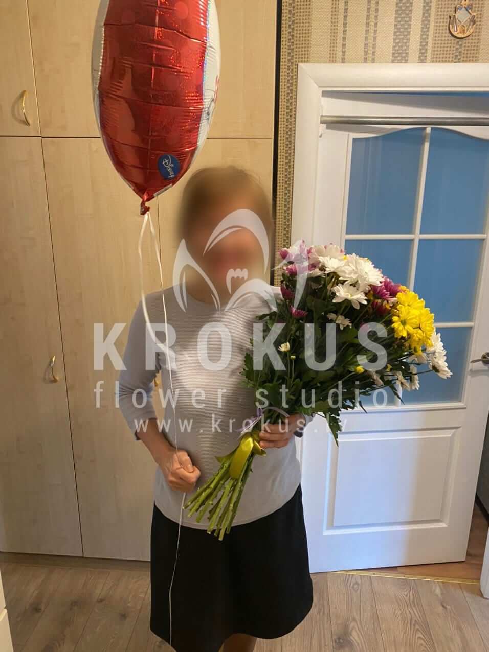 Mēs piegādājām vēl vienu pasūtījumu uz pilsētu Rīga. Pasūtītājs vēlējās: Ziedu piegāde Krizantēmu pušķis MIX (Pušķa sastāvs var nedaudz atšķirties no attēlā redzamā, atkarībā no sezonas!). Ziedu piegāde Folija Balons 18x45cm