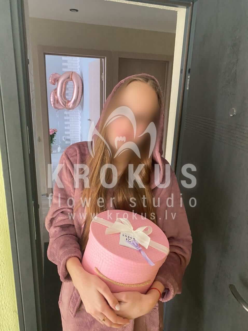 Mēs piegādājām vēl vienu pasūtījumu uz pilsētu Rīga. Pasūtītājs vēlējās: Ziedu piegāde Flowerbox ar makarūniem (macaron) (Izmērs: