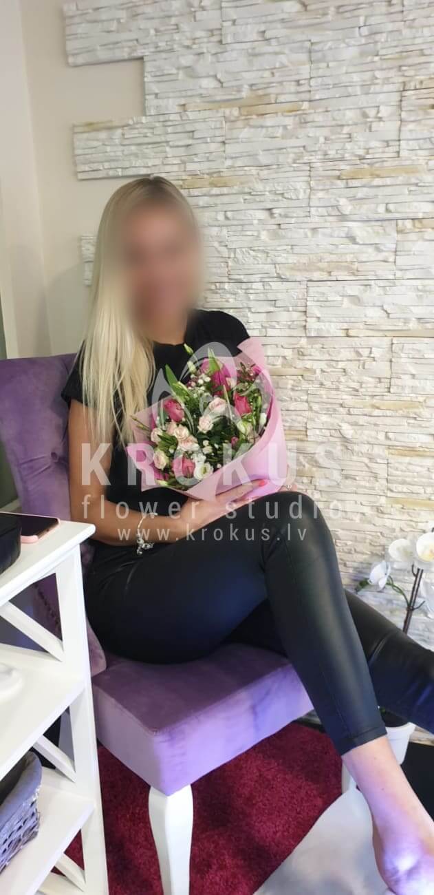 Ziedu sastāvā: Rozā rozes, Krūmrozes, Lizantes, Veronika, Tulpes, Gypsophila (Ģipsene), Ruskuss.