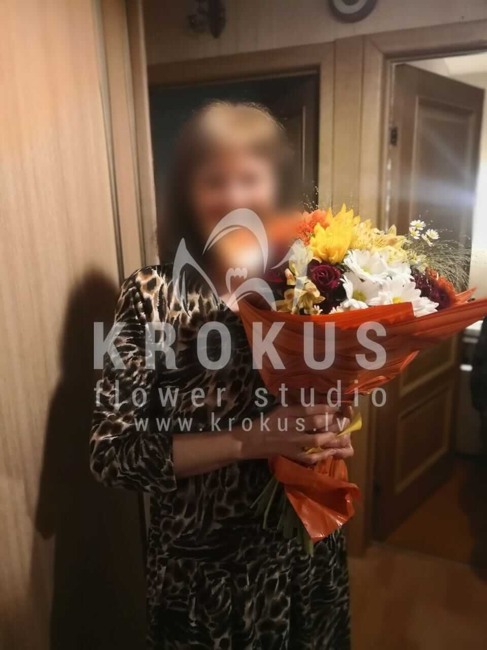 Ziedu sastāvā: Saulespuķes, Krūmrozes, Krizantēmas, Hypericum, Solidago, Gerberas, Pļavas puķes.