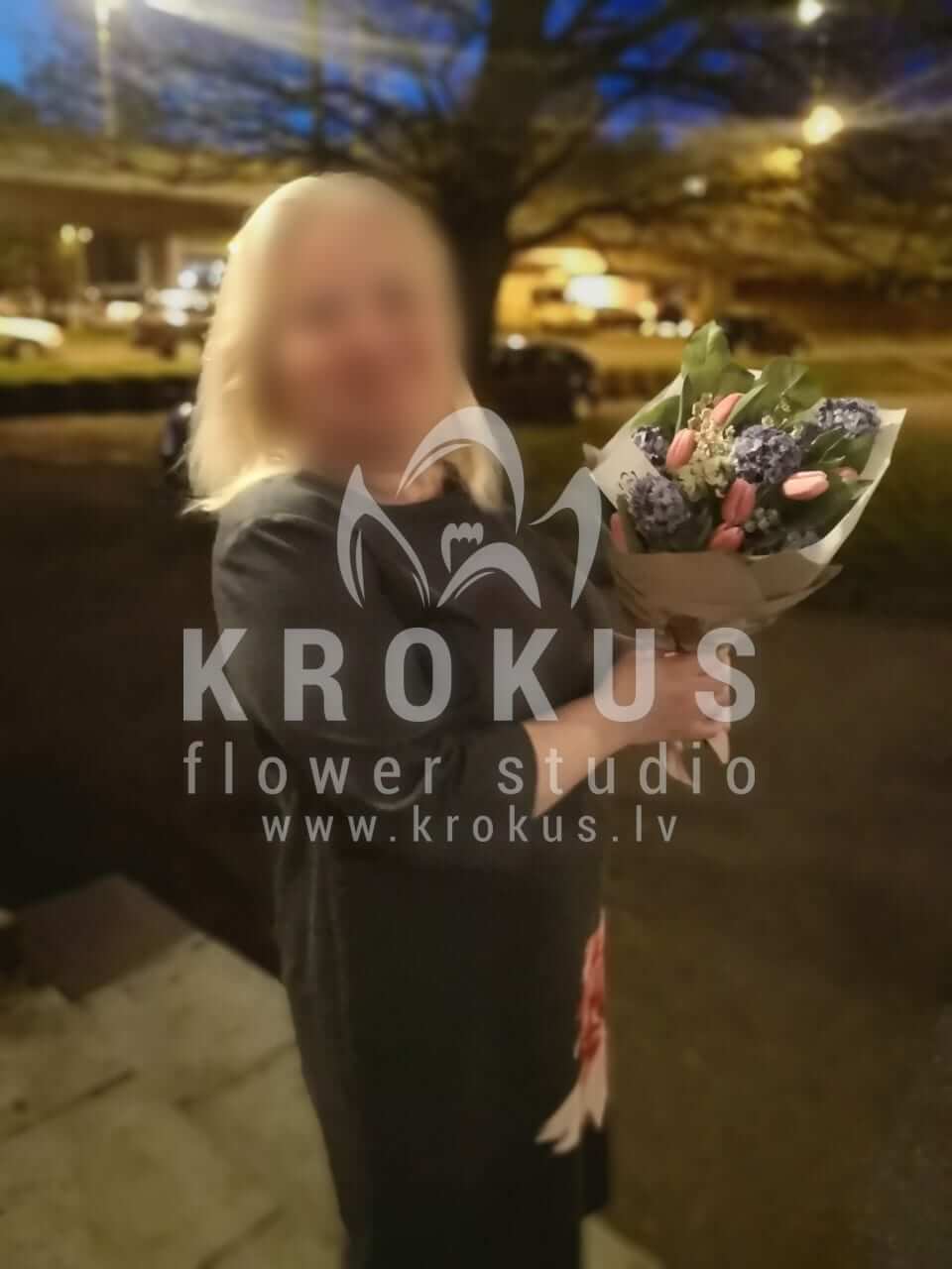 Ziedu sastāvā: Hiacinte, Tulpes, Gypsophila (Ģipsene).