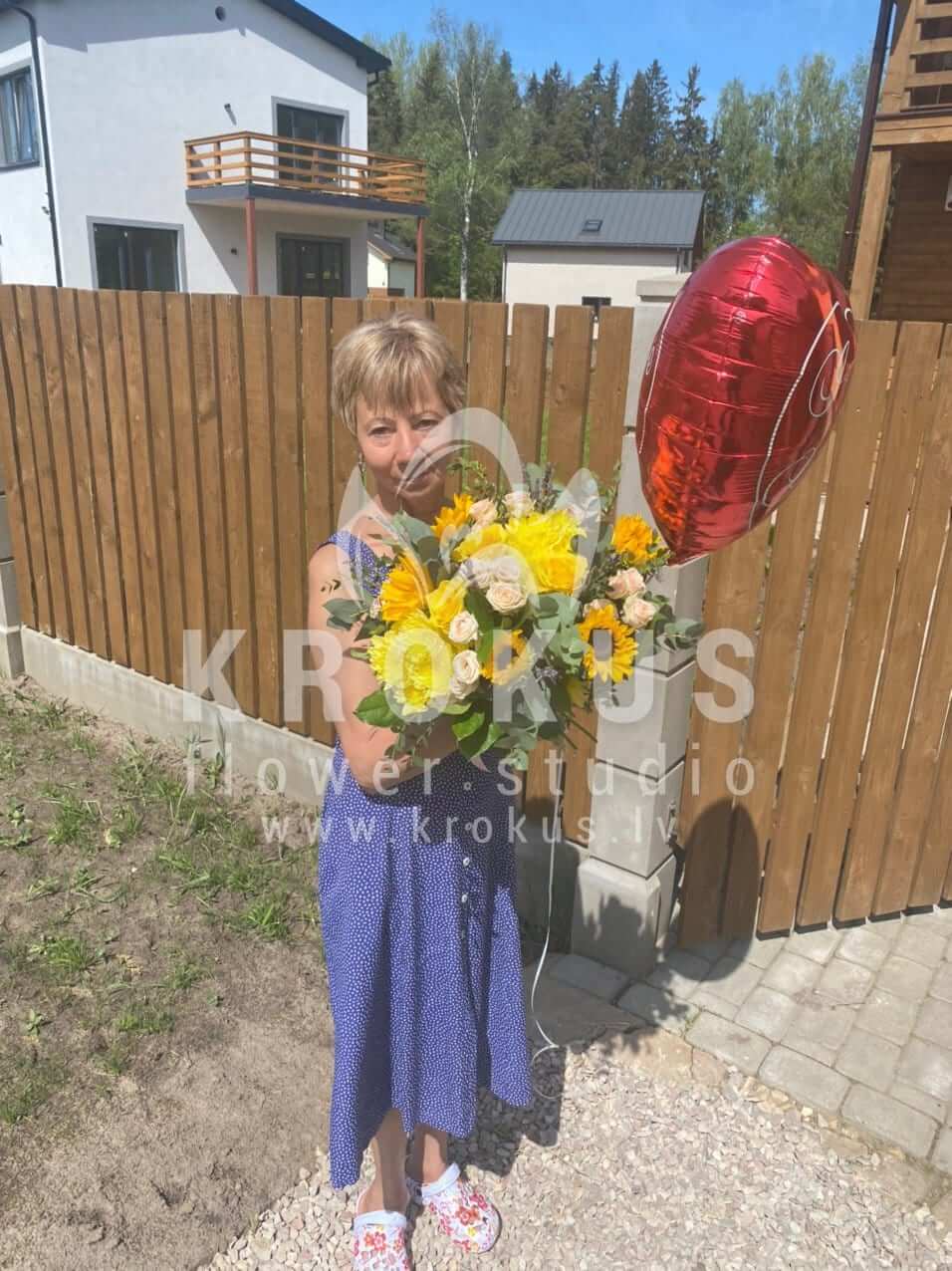 Ziedu sastāvā: Saulespuķes, Dzeltenas rozes, Krūmrozes, Krizantēmas, Lavanda, Eikalipts, Pistācija.