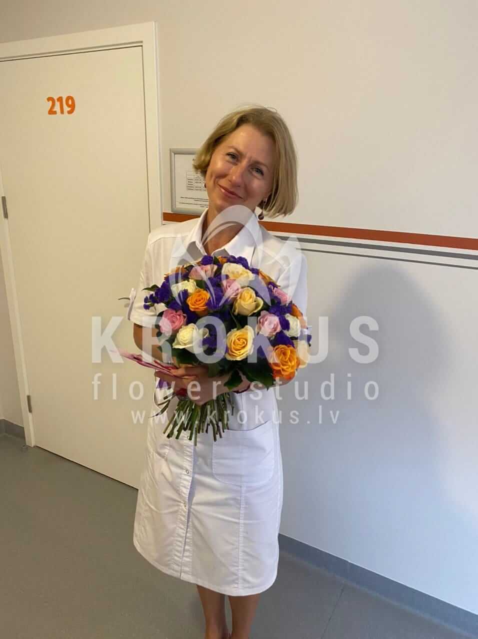 Ziedu sastāvā: Baltas rozes, Oranžas rozes, Krēmkrāsas rozes, Rozā rozes, Statice.