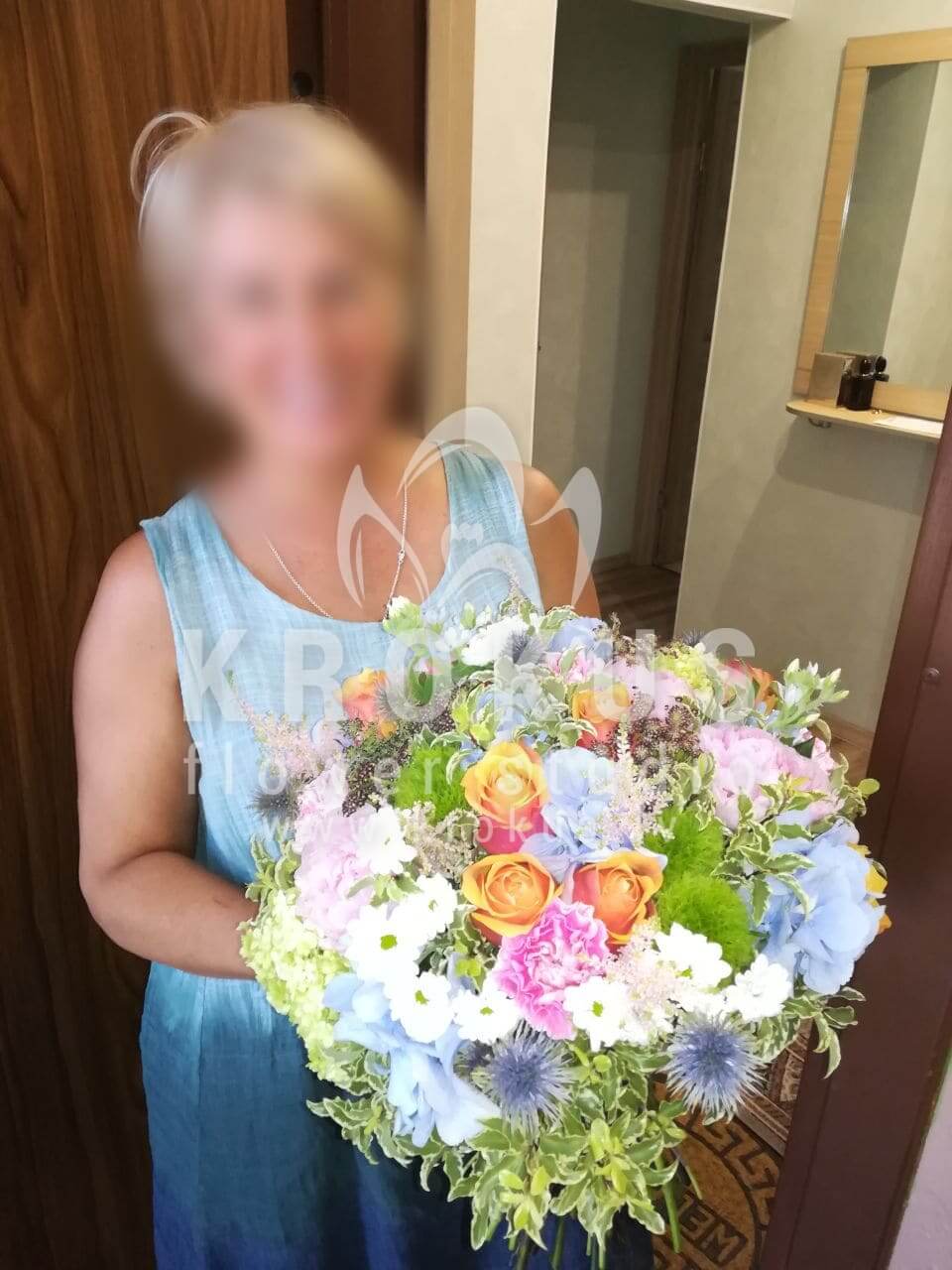 Ziedu sastāvā: Krizantēmas, Divkrāsu rozes, Hortenzijas, Veronika, Solidago, Limonija, Eryngium, Pitosporas, Neļķes.