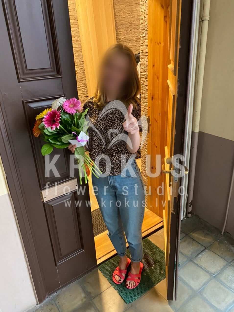 Mēs piegādājām vēl vienu pasūtījumu uz pilsētu Rīga. Pasūtītājs vēlējās: Ziedu piegāde Gerberu pušķis "Saulīte" (Kādu krāsu gerberas tik nav! Šiku ziedu pušķi mēs esam radījuši no dažādu krāsu gerberām. Sarkanām, rozā, oranžām, violetām un baltām. Šīs ir spilgtas, piesātinātas krāsas. Saulainā lente ir harmonijā ar pamata fona pušķi un saglabā savu eleganto tēlu. Jūtat pacilājošu garastāvokli? Un pasaule radīs varavīksni ap Jums!!!)