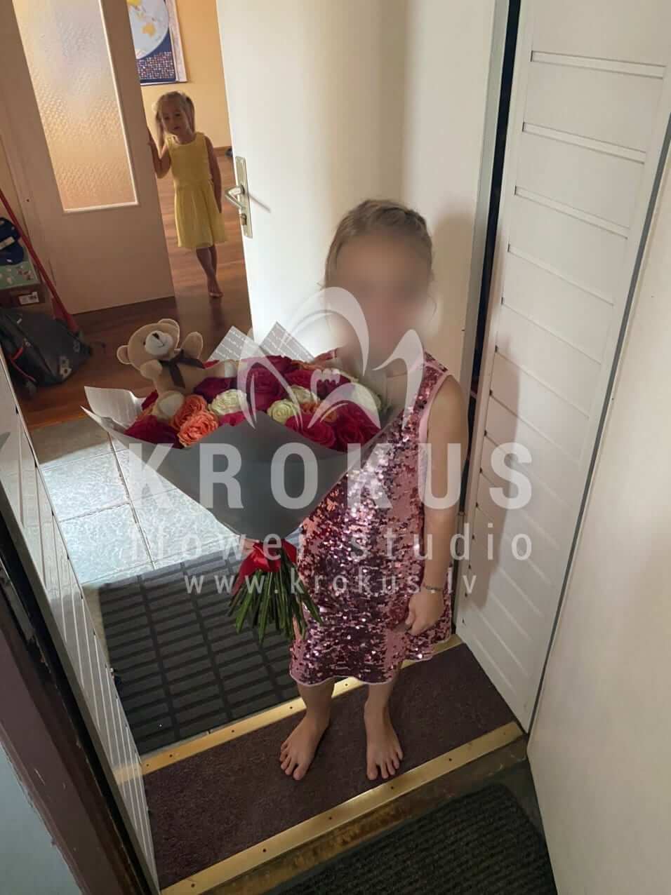 Ziedu sastāvā: Rozā rozes, Sarkanas rozes, Dzeltenas rozes, Baltas rozes, Oranžas rozes.