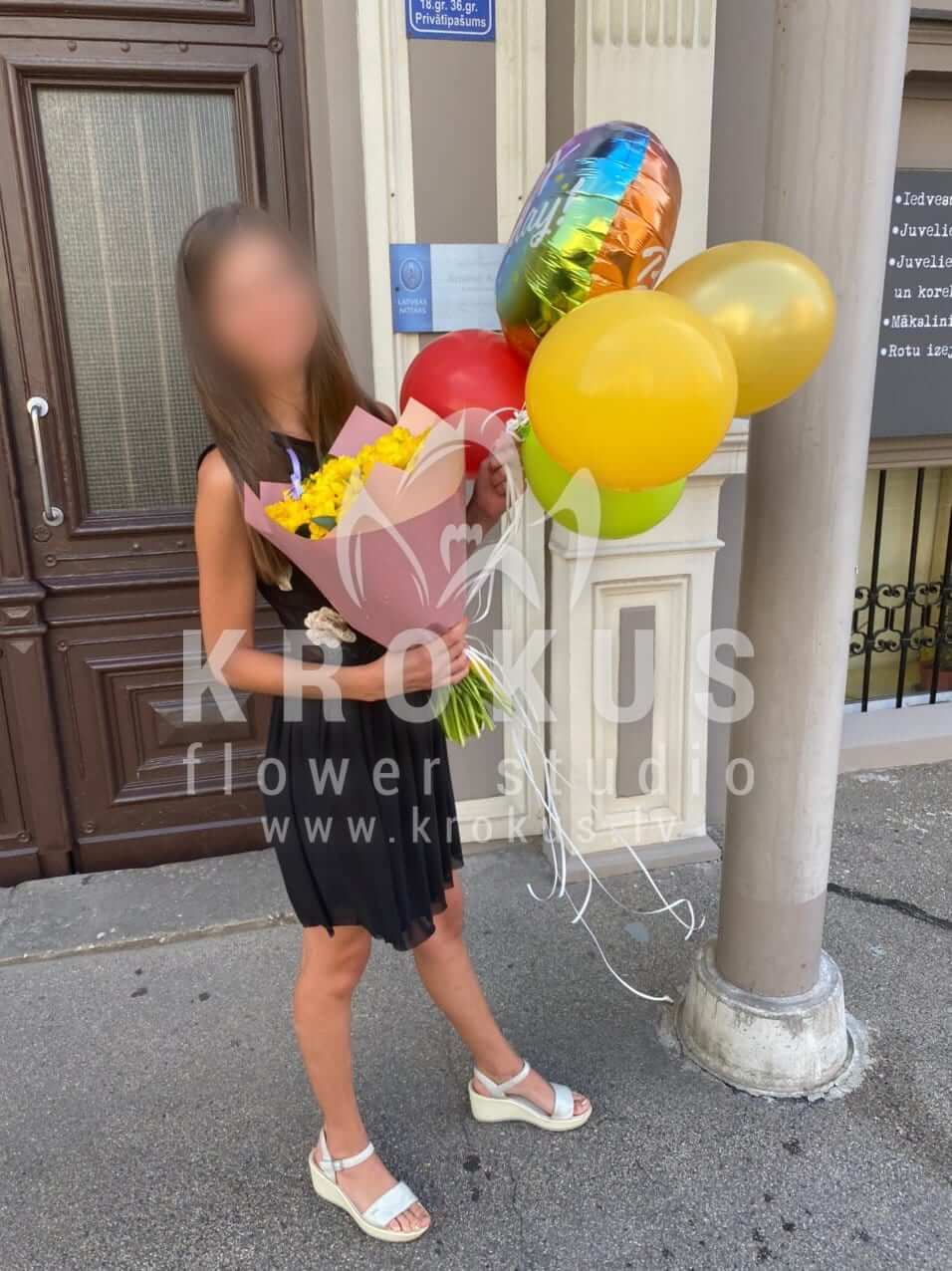 Mēs piegādājām vēl vienu pasūtījumu uz pilsētu Rīga. Pasūtītājs vēlējās: Ziedu piegāde Dzelteno frēziju pušķis (Attēlam fotogrāfijā ir ilustratīvs raksturs. Ja Jums ir svarīgi saņemt frezijas noteiktā gatavības stadijā, lūdzam sazināties ar mums pirms veicat pasūtījumu.). Ziedu piegāde Hēlija baloni asortimentā (cena par 1 gab). Ziedu piegāde Balons Daudz laimes