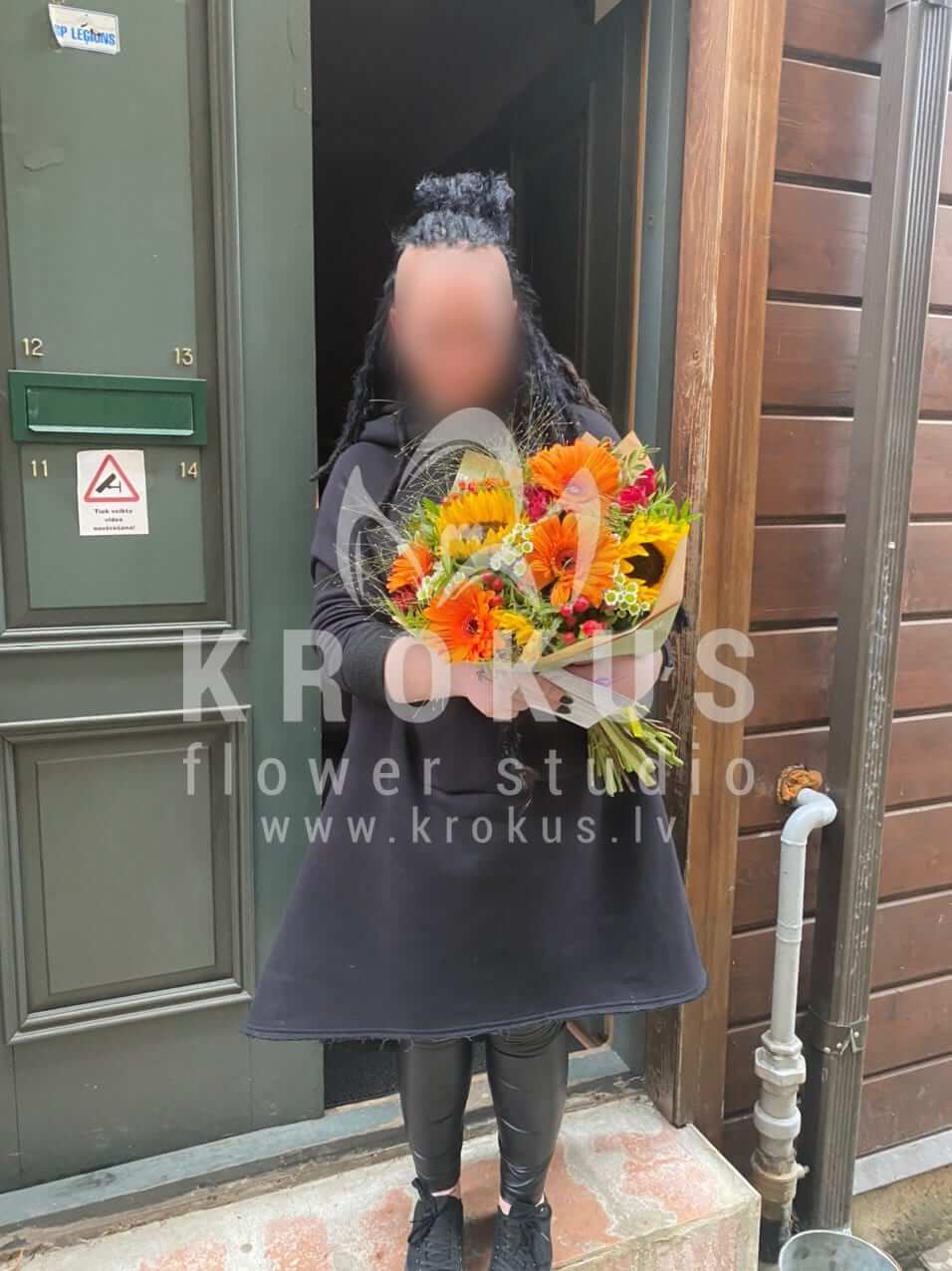 Ziedu sastāvā: Saulespuķes, Krūmrozes, Krizantēmas, Hypericum, Solidago, Gerberas, Pļavas puķes.