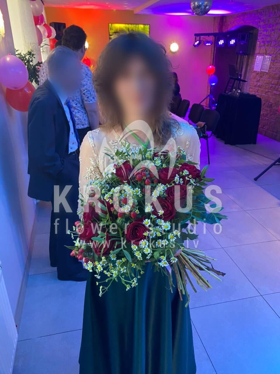 Ziedu sastāvā: Sarkanas rozes, Pistācija, Hypericum, Kumelīte.