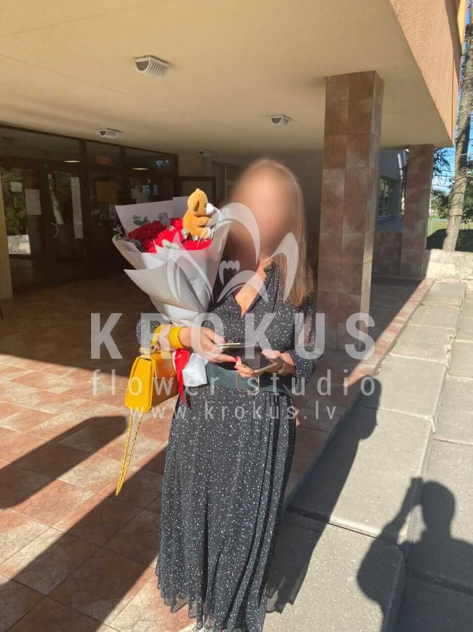 Mēs piegādājām vēl vienu pasūtījumu uz pilsētu Rīga. Pasūtītājs vēlējās: Ziedu piegāde Krāsaino neļķu pušķis. Ziedu piegāde Lācēns uz kociņa 12cm