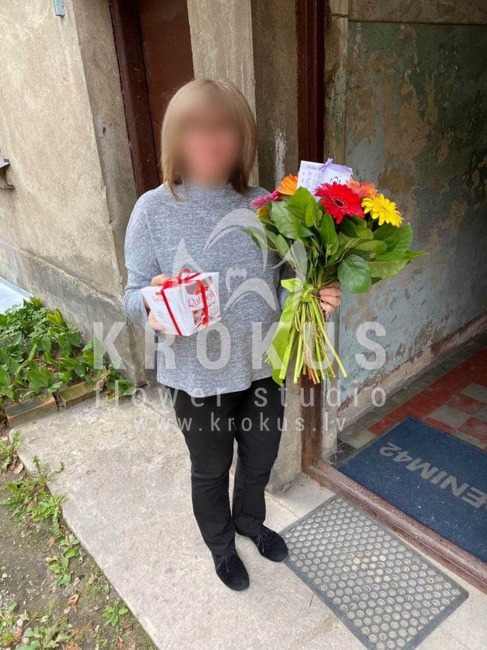 Mēs piegādājām vēl vienu pasūtījumu uz pilsētu Rīga. Pasūtītājs vēlējās: Ziedu piegāde Gerberu pušķis "Saulīte" (Kādu krāsu gerberas tik nav! Šiku ziedu pušķi mēs esam radījuši no dažādu krāsu gerberām. Sarkanām, rozā, oranžām, violetām un baltām. Šīs ir spilgtas, piesātinātas krāsas. Saulainā lente ir harmonijā ar pamata fona pušķi un saglabā savu eleganto tēlu. Jūtat pacilājošu garastāvokli? Un pasaule radīs varavīksni ap Jums!!!). Ziedu piegāde Raffaello 150g (Konfektes RAFFAELLO, 150g