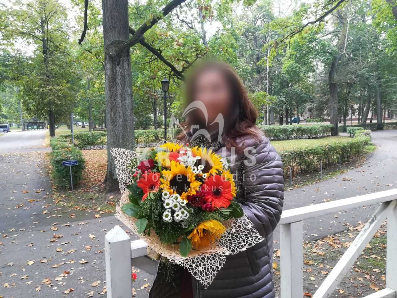 Ziedu sastāvā: Saulespuķes, Krūmrozes, Krizantēmas, Hypericum, Solidago, Gerberas, Pļavas puķes.