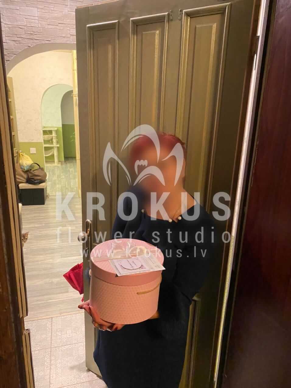 Mēs piegādājām vēl vienu pasūtījumu uz pilsētu Rīga. Pasūtītājs vēlējās: Ziedu piegāde Flowerbox ar macarooniem (Izmērs: