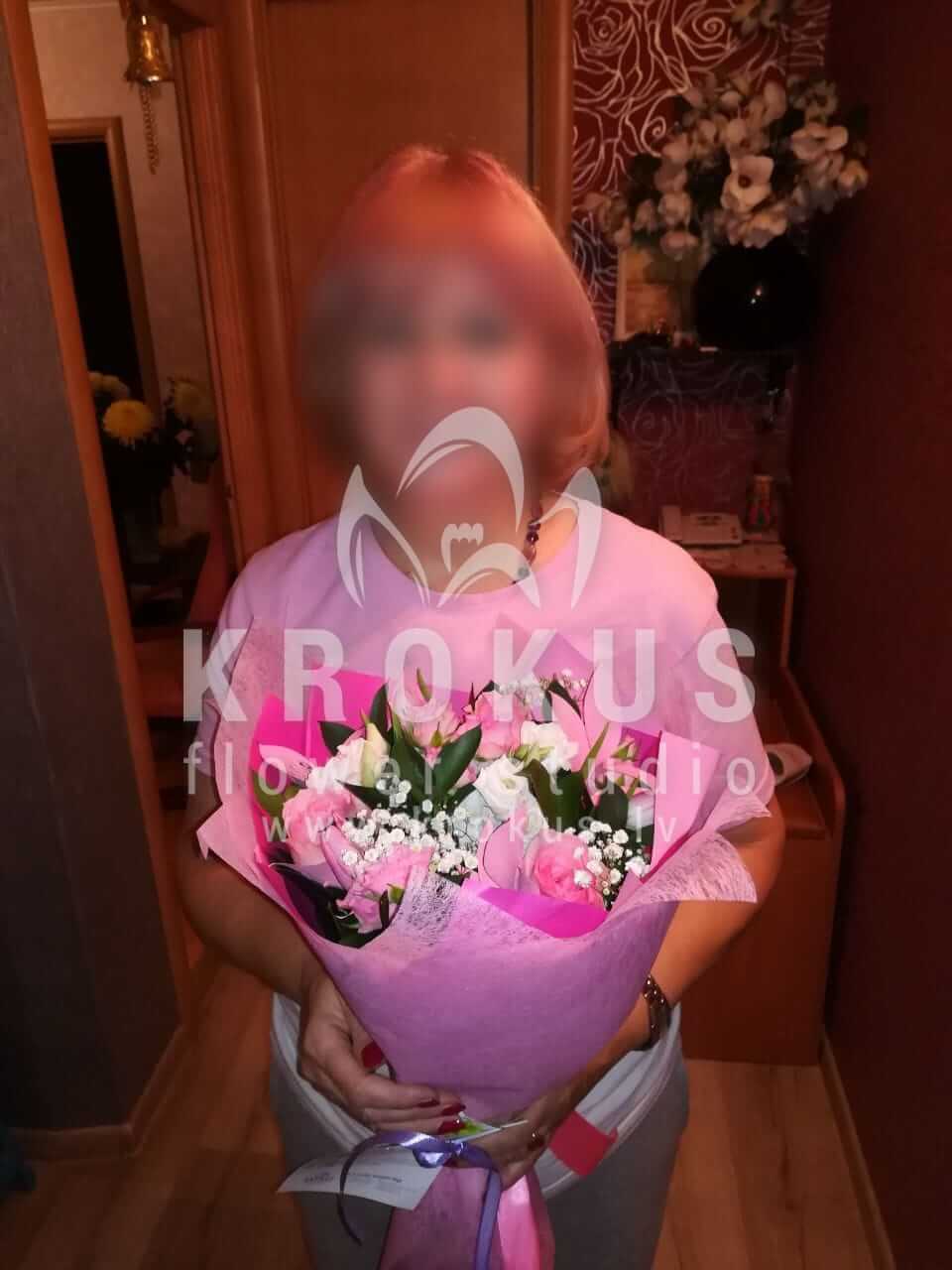 Ziedu sastāvā: Rozā rozes, Krūmrozes, Lizantes, Veronika, Tulpes, Gypsophila (Ģipsene), Ruskuss.