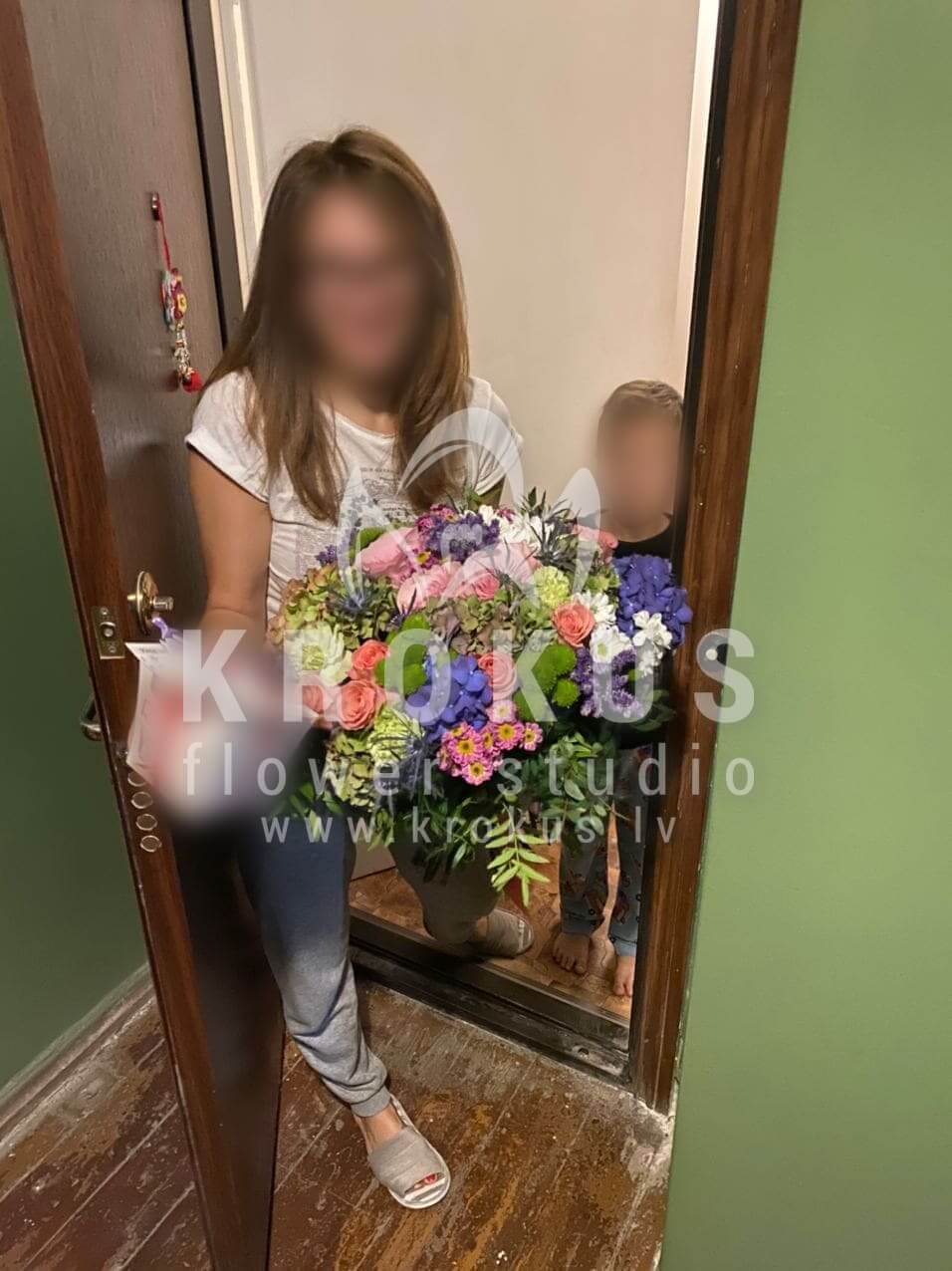 Ziedu sastāvā: Krizantēmas, Divkrāsu rozes, Hortenzijas, Veronika, Solidago, Limonija, Eryngium, Pitosporas, Neļķes.