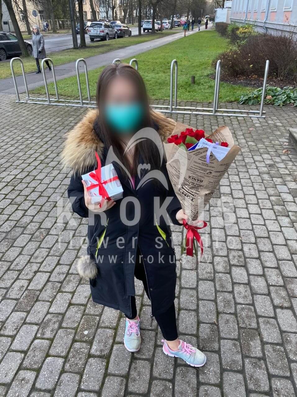 Mēs piegādājām vēl vienu pasūtījumu uz pilsētu Rīga. Pasūtītājs vēlējās: Ziedu piegāde 101 roze + Makarūnu kastīte (Superakcija: 101 roze + makarūnu kastīte!