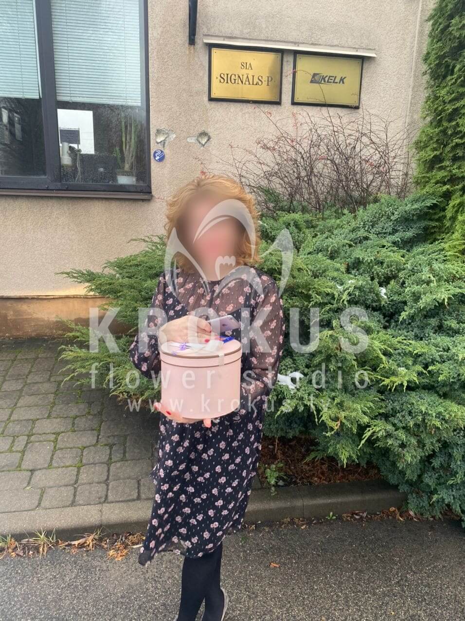 Mēs piegādājām vēl vienu pasūtījumu uz pilsētu Rīga. Pasūtītājs vēlējās: Ziedu piegāde Flowerbox ar makarūniem (macaron) (Izmērs: