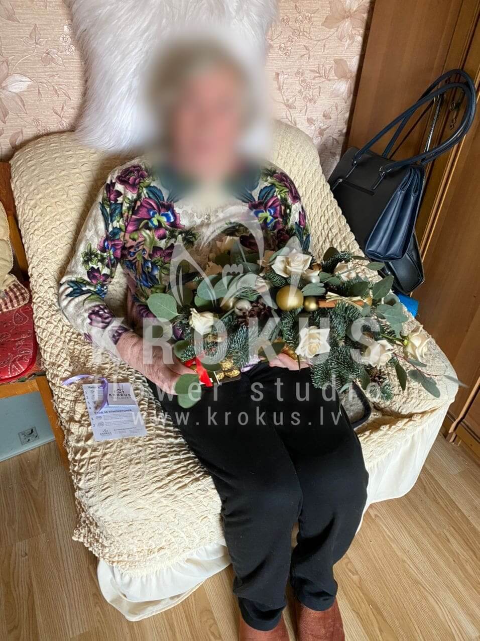 Ziedu sastāvā: Krūmrozes, Nobilis egle, Dekors, Eikalipts, Kanēlis.