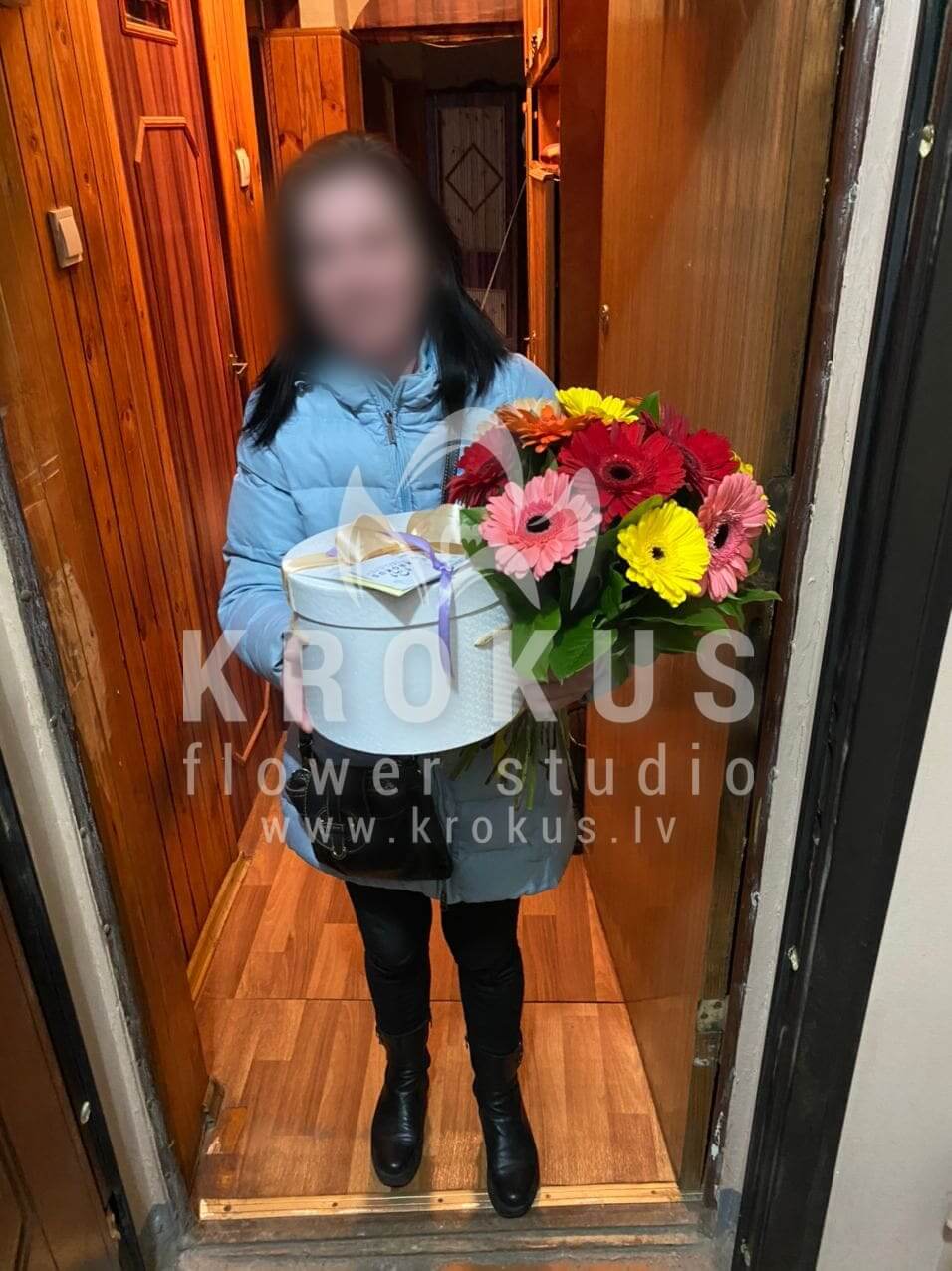 Fotogrāfijai ir ilustratīvs nolūks. Kastes krāsa var atšķirties.). Ziedu piegāde Gerberu pušķis "Saulīte" (Kādu krāsu gerberas tik nav! Šiku ziedu pušķi mēs esam radījuši no dažādu krāsu gerberām. Sarkanām, rozā, oranžām, violetām un baltām. Šīs ir spilgtas, piesātinātas krāsas. Saulainā lente ir harmonijā ar pamata fona pušķi un saglabā savu eleganto tēlu. Jūtat pacilājošu garastāvokli? Un pasaule radīs varavīksni ap Jums!!!)