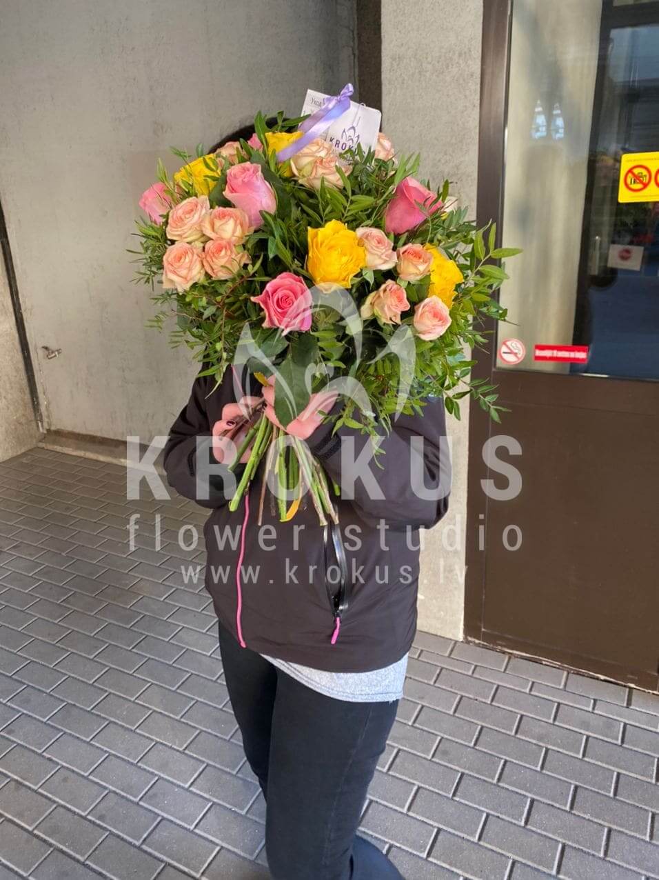 Ziedu sastāvā: Rozā rozes, Dzeltenas rozes, Krūmrozes, Pistācija.
