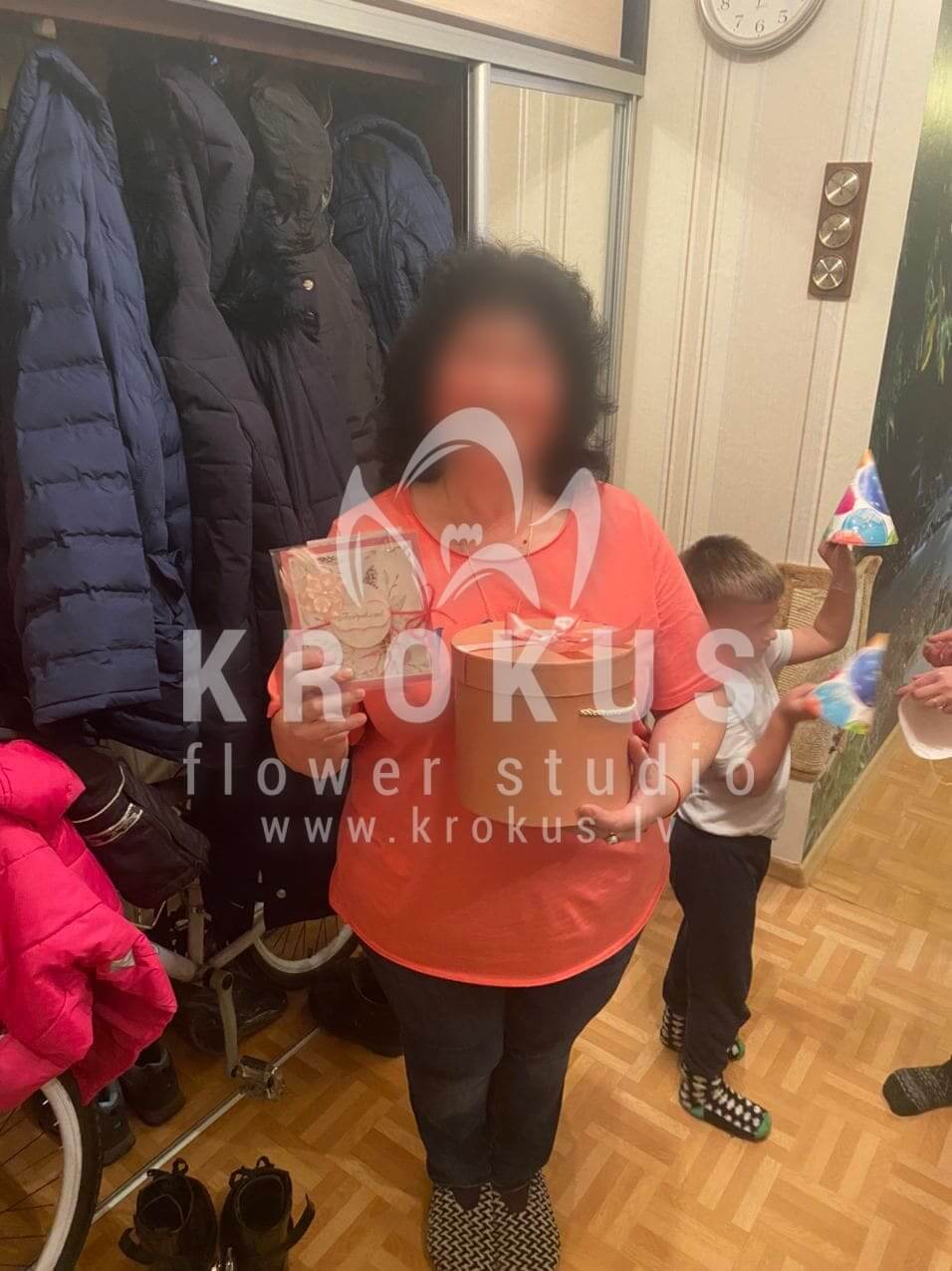 Mēs piegādājām vēl vienu pasūtījumu uz pilsētu Rīga. Pasūtītājs vēlējās: Ziedu piegāde Flowerbox ar macarooniem (Izmērs: