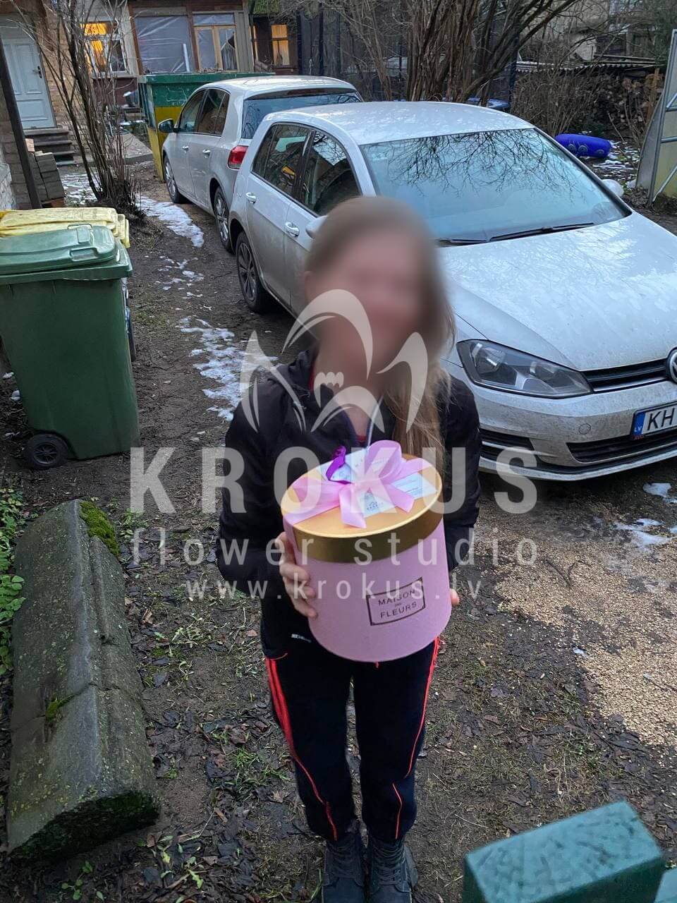 Mēs piegādājām vēl vienu pasūtījumu uz pilsētu Rīga. Pasūtītājs vēlējās: Ziedu piegāde Flowerbox ar makarūniem (macaron) (Izmērs: