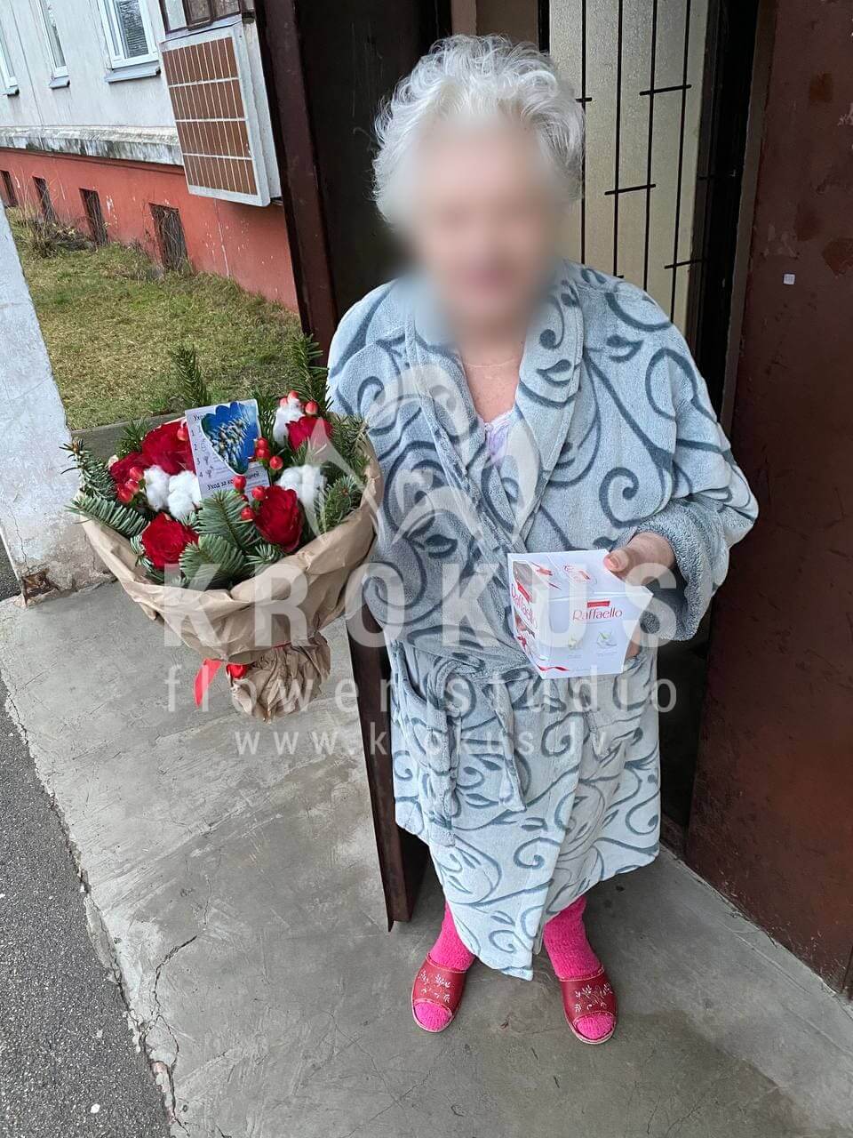 Mēs piegādājām vēl vienu pasūtījumu uz pilsētu Rīga. Pasūtītājs vēlējās: Ziedu piegāde Ziemassvētku eglītes aromāts. Ziedu piegāde Raffaello 150g (Konfektes RAFFAELLO, 150g