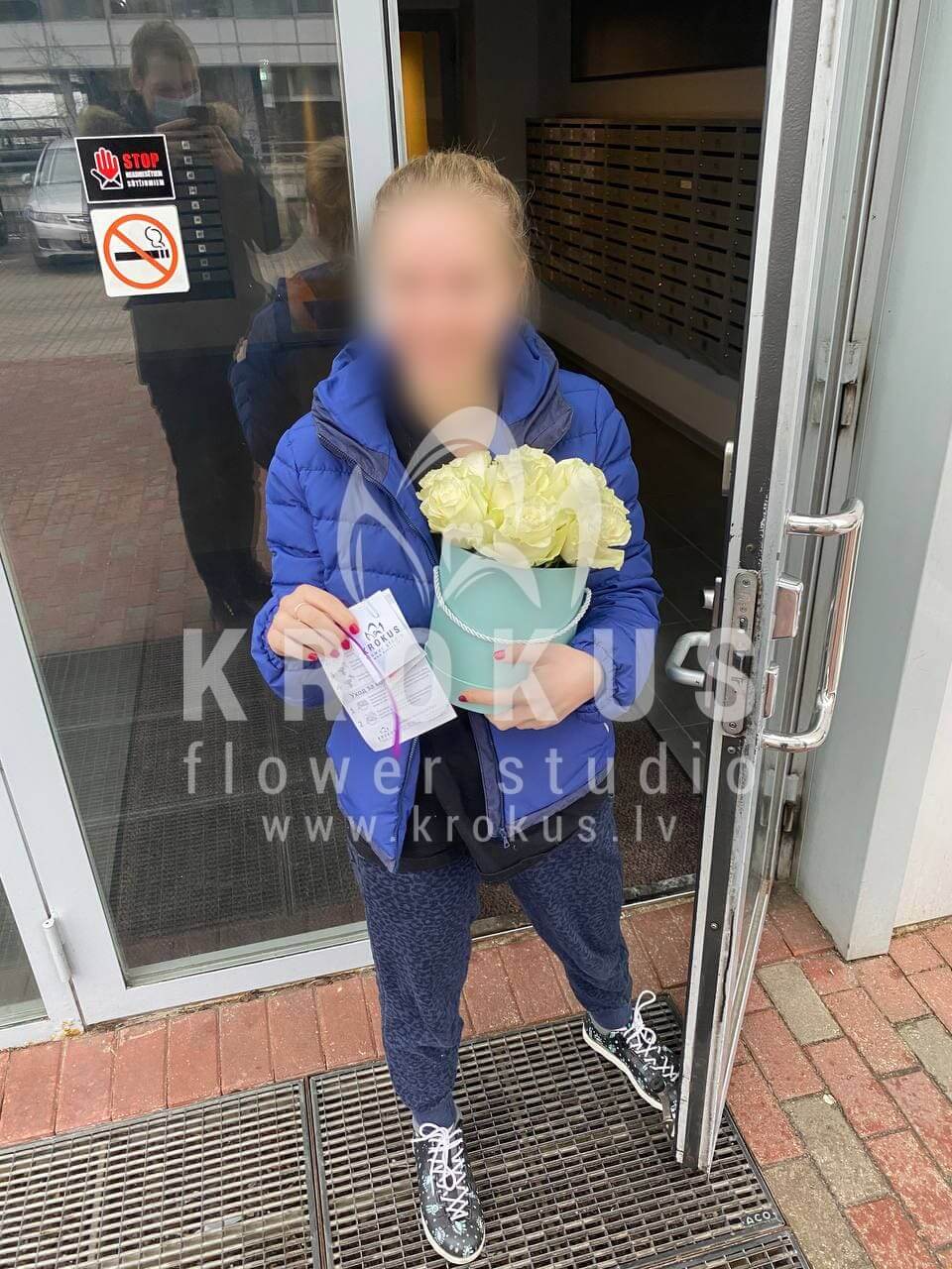 Ziedu sastāvā: Krēmkrāsas rozes, Stilīga kastīte.