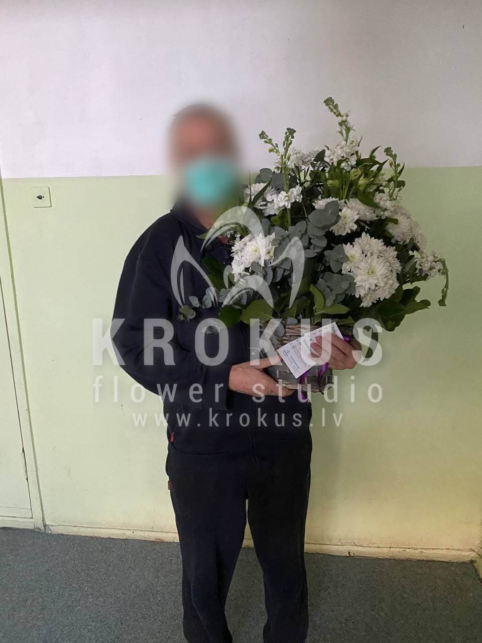 Ziedu sastāvā: Krizantēmas, Alstremērija, Lauvmutītes, Matiola, Salal (Goltjēra), Eikalipts, Ligustrs.