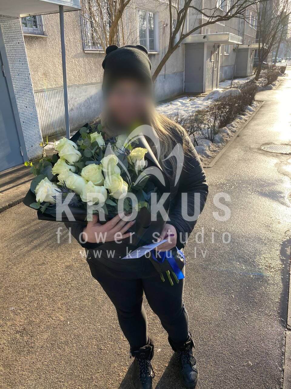 Ziedu sastāvā: Baltas rozes, Eikalipts.