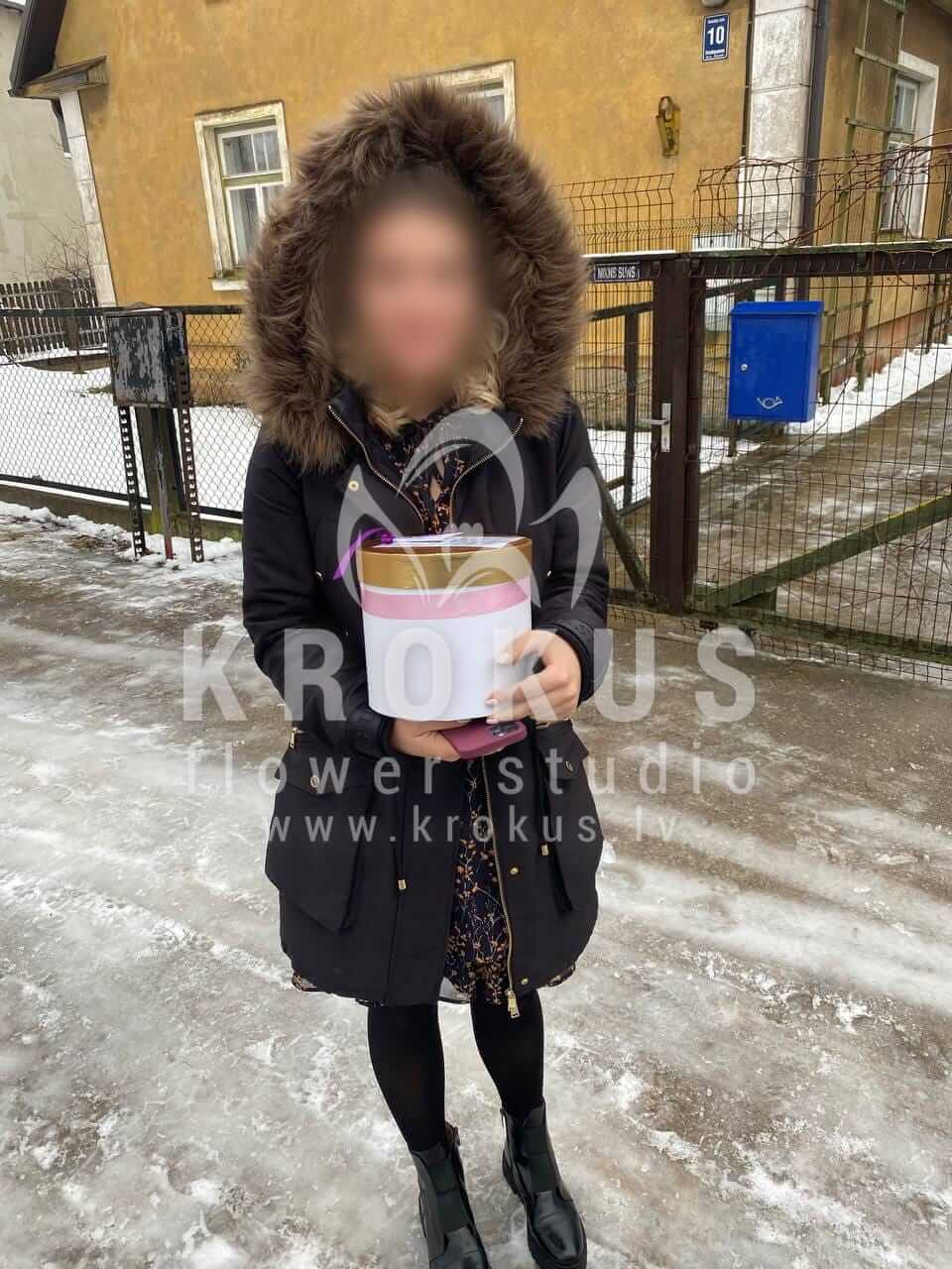 Mēs piegādājām vēl vienu pasūtījumu uz pilsētu Rīga. Pasūtītājs vēlējās: Ziedu piegāde Flowerbox ar makarūniem (macaron) (Izmērs:
