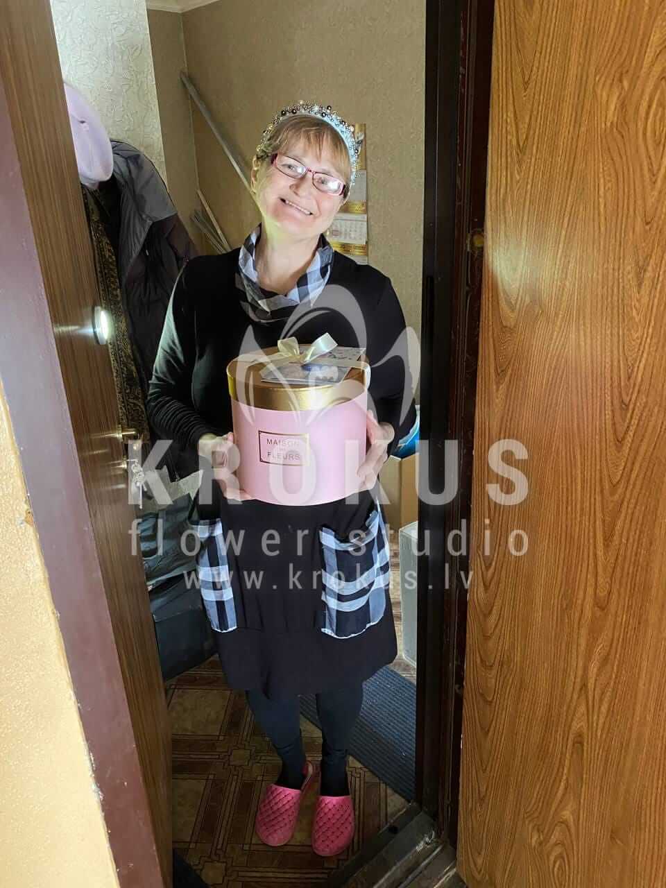 Mēs piegādājām vēl vienu pasūtījumu uz pilsētu Rīga. Pasūtītājs vēlējās: Ziedu piegāde Flowerbox ar macarooniem (Izmērs: