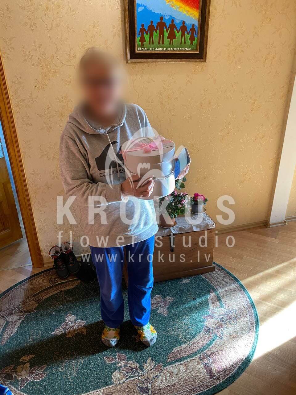 Mēs piegādājām vēl vienu pasūtījumu uz pilsētu Rīga. Pasūtītājs vēlējās: Ziedu piegāde Flowerbox ar macarooniem (Izmērs:
