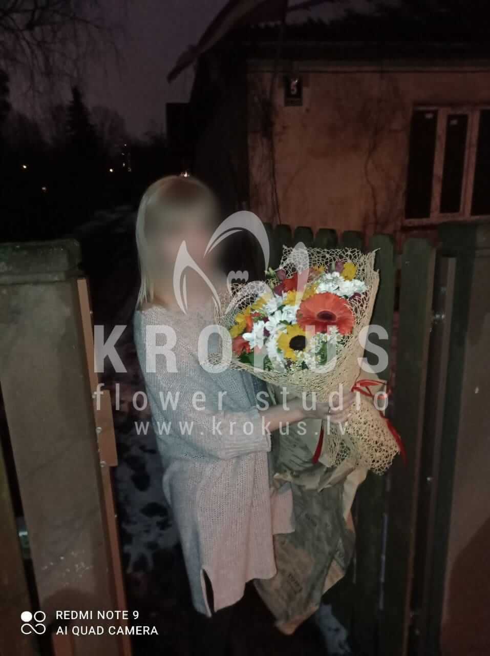 Ziedu sastāvā: Saulespuķes, Krūmrozes, Krizantēmas, Hypericum, Solidago, Gerberas, Pļavas puķes.