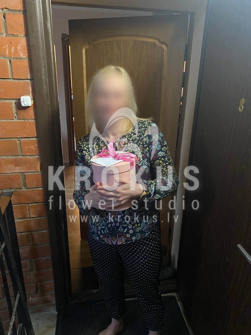 Mēs piegādājām vēl vienu pasūtījumu uz pilsētu Rīga. Pasūtītājs vēlējās: Ziedu piegāde Flowerbox ar macarooniem (Izmērs: