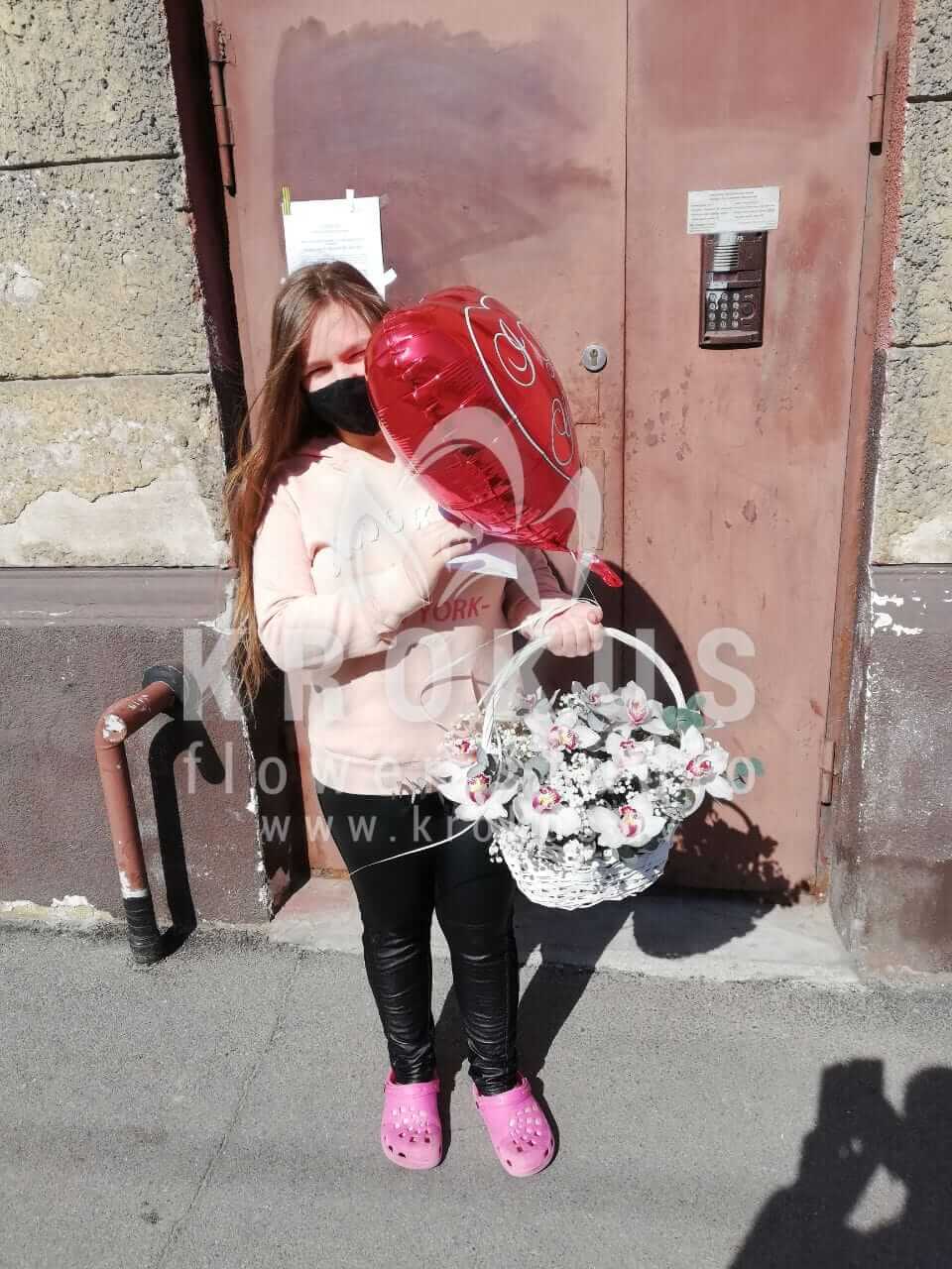 Mēs piegādājām vēl vienu pasūtījumu uz pilsētu Rīga. Pasūtītājs vēlējās: Ziedu piegāde Baltas orhidejas grozā (Šobrīd nav orhideju sezona, pasūtot šo kompozīciju, mūsu administrators ar Jums sazināsies un piedāvās samainīt uz citiem ziediem vai cita veida orhideju.). Ziedu piegāde Folija Balons sirds 18x45cm