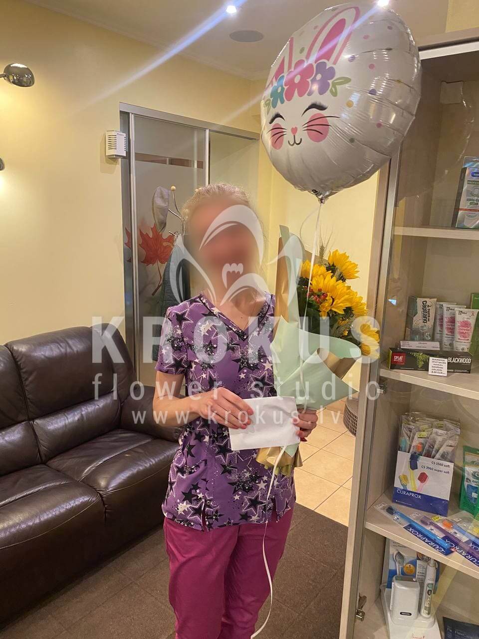 Mēs piegādājām vēl vienu pasūtījumu uz pilsētu Rīga. Pasūtītājs vēlējās: Ziedu piegāde Pušķis no saulespuķēm (Pušķa sastāvs var nedaudz atšķirties no attēlā redzamā, atkarībā no sezonas!). Ziedu piegāde Follija Balons Zaķēns 46cm