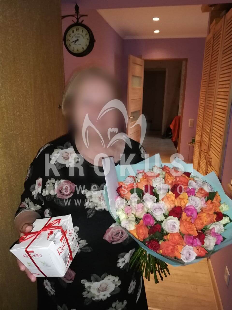 Mēs piegādājām vēl vienu pasūtījumu uz pilsētu Rīga. Pasūtītājs vēlējās: Ziedu piegāde Krāsaini svētki (Pušķa sastāvs var nedaudz atšķirties no attēlā redzamā, atkarībā no sezonas!). Ziedu piegāde Raffaello 150g (Konfektes RAFFAELLO, 150g