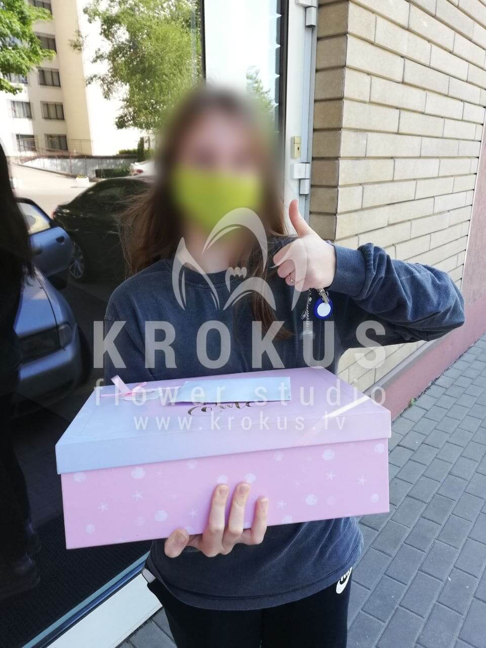 Mēs piegādājām vēl vienu pasūtījumu uz pilsētu Rīga. Pasūtītājs vēlējās: Ziedu piegāde Flowerbox ar macarooniem (Izmērs:
