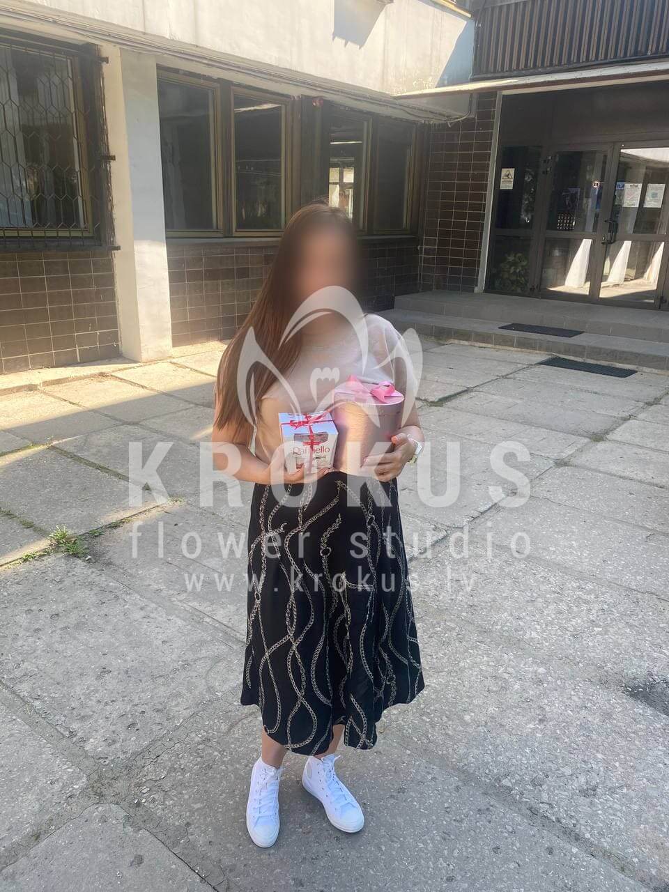 Mēs piegādājām vēl vienu pasūtījumu uz pilsētu Rīga. Pasūtītājs vēlējās: Ziedu piegāde Flowerbox ar macarooniem (Izmērs:
